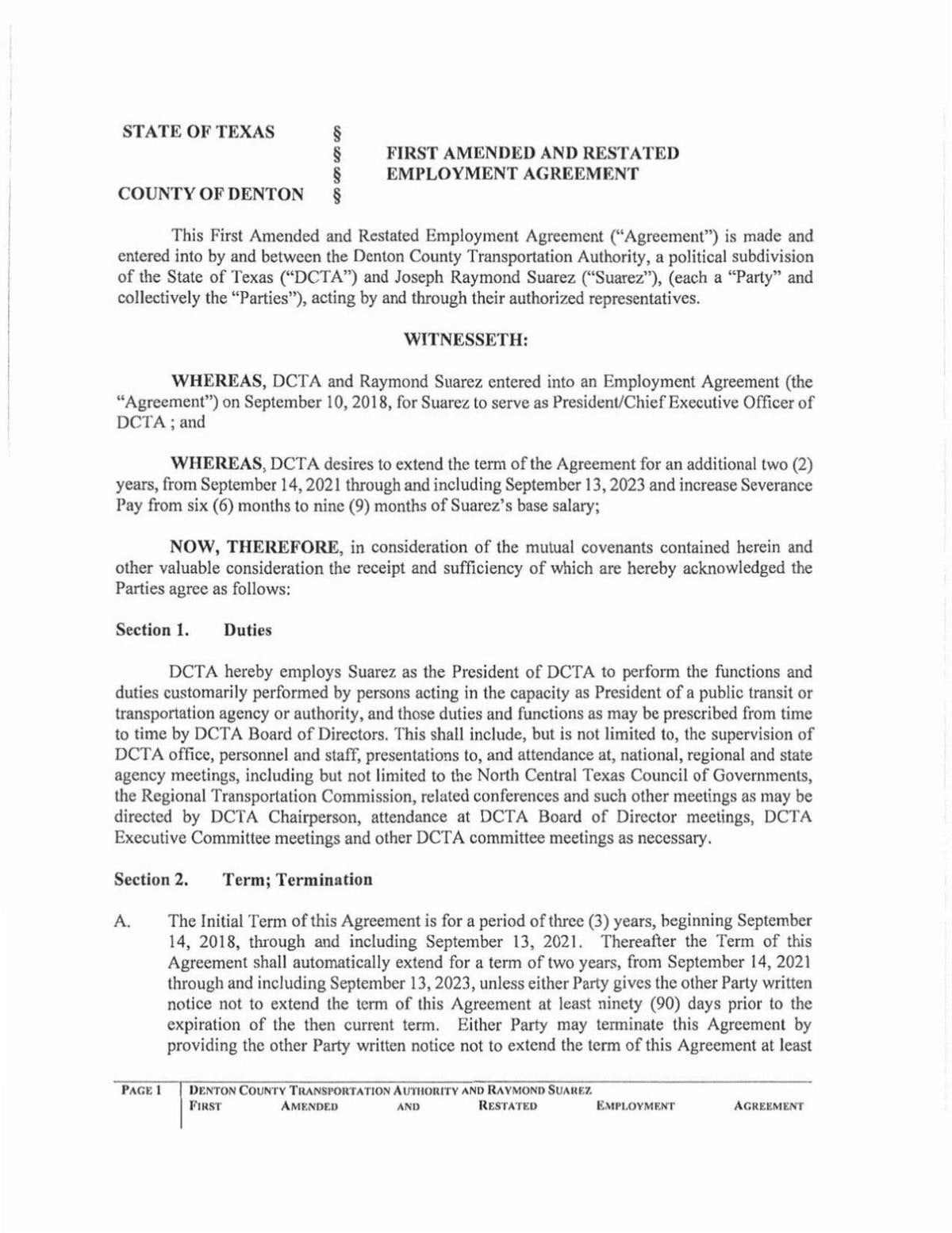 “In the event of termination by DCTA without cause, Suarez shall be entitled to receive expenses for severance in a lump sum payment equal to nine (9) months of base salary as the sole and exclusive termination remedy,” reads Section 4 (A) of the contract.