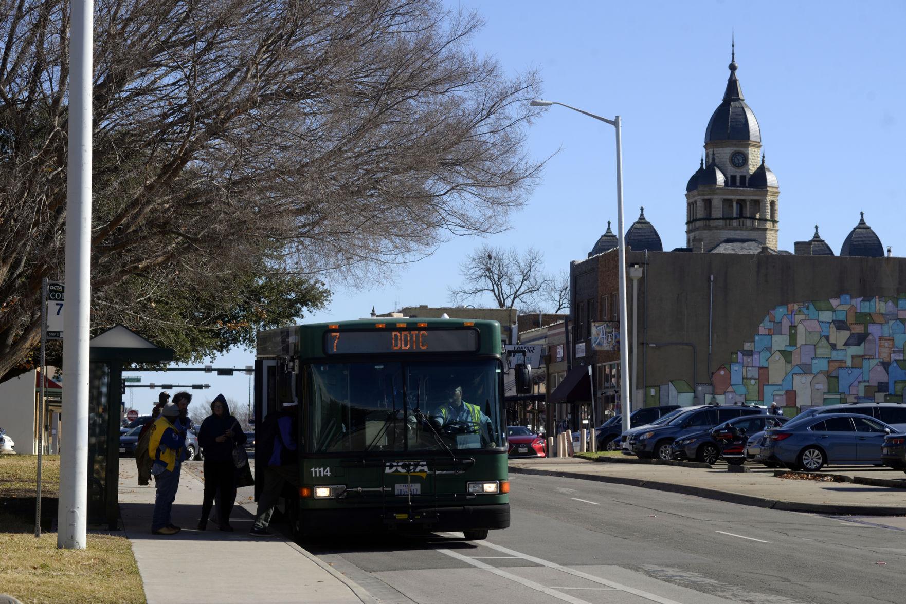 People board the Denton County Transportation Authority Route 7 bus on Oak Street near St. Andrew Presbyterian Church.