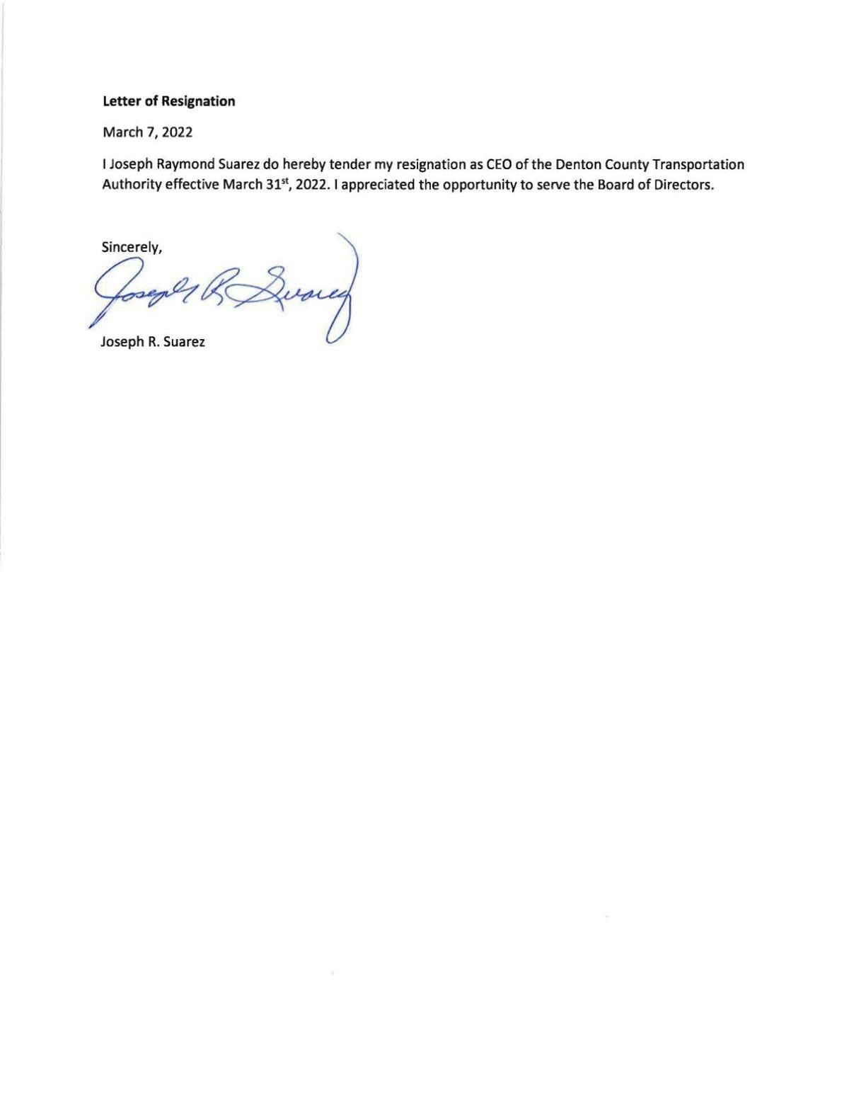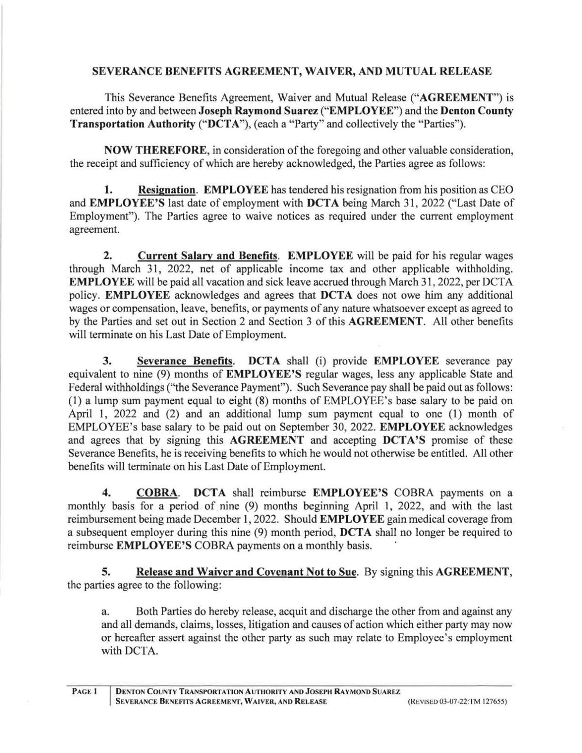 But Suarez was not officially terminated. A copy of his severance benefits agreement, waiver and mutual release shows he formally resigned, with Suarez and DCTA agreeing to waive the required 90-day resignation notice. His March 7 letter of resignation spans two sentences, simply stating that he is resigning and “appreciated the opportunity to serve the Board of Directors.”