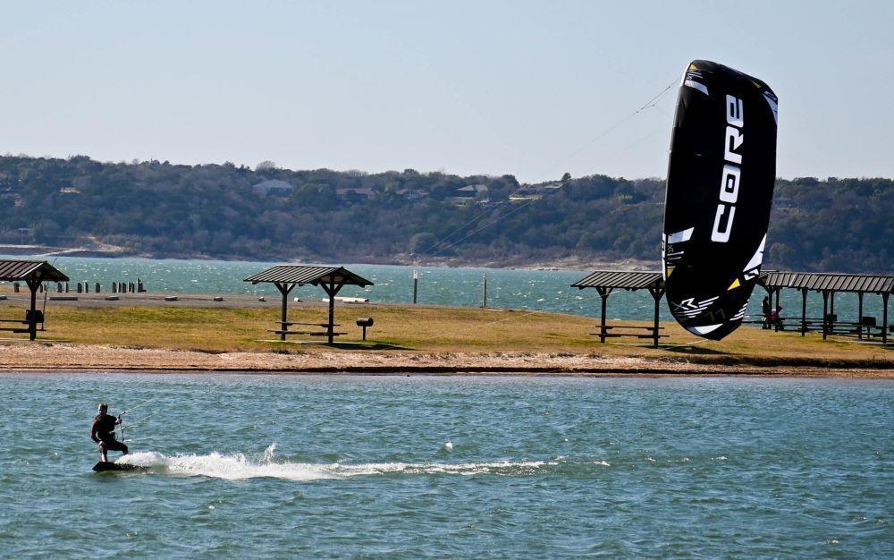 A kite surfer takes advantage of a steady breeze and warm temperatures on Feb. 3, 2021, to spend some time being pulled across the water by a power kite at Temple Lake Park on Lake Belton.