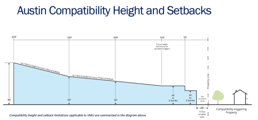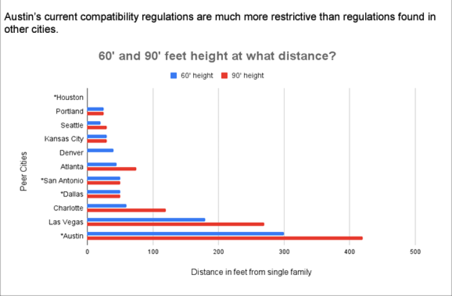 According to an analysis by city staff, Austin has some of — if not, the most — restrictive compatibility requirements when compared to cities similar in size. In Seattle, for example, a developer can build up to 60 feet high once it gets at least 50 feet away from a single-family zone; in order to build this tall in Austin you’d need to move at least 300 feet away from a single-family home.