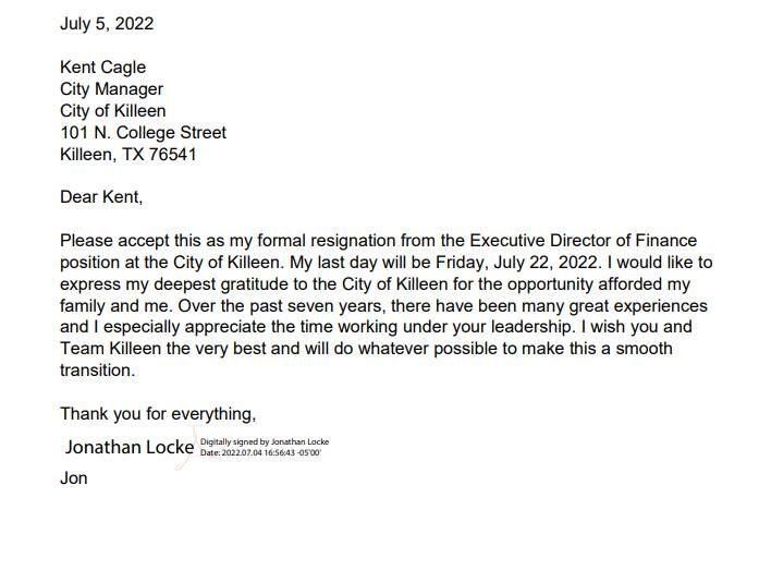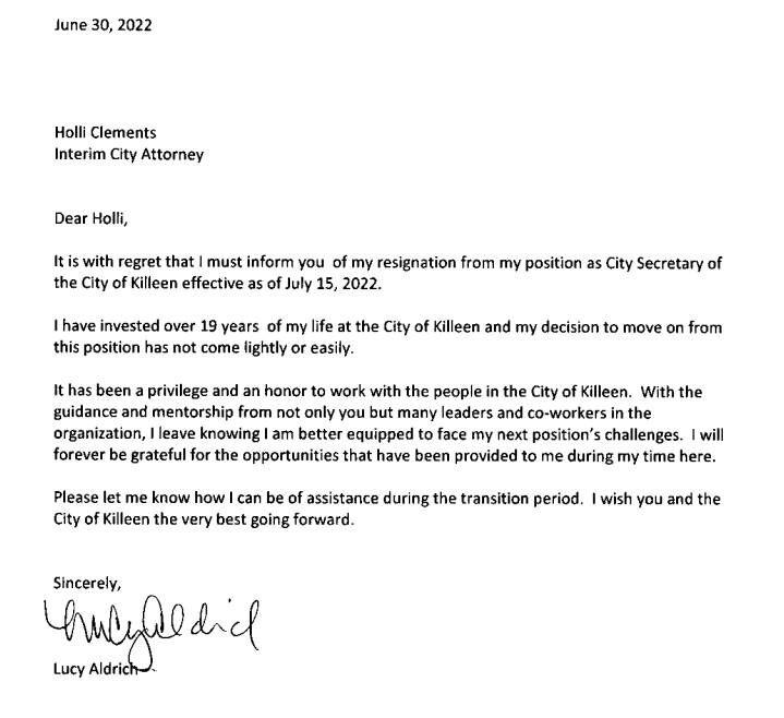 Through a Texas Public Information Act request, the Killeen Daily Herald obtained the resignation letters of Executive Director of Finance Jonathan Locke and City Secretary Lucy Aldrich, with the latter’s last day scheduled for July 15 and Locke’s planned for July 22.