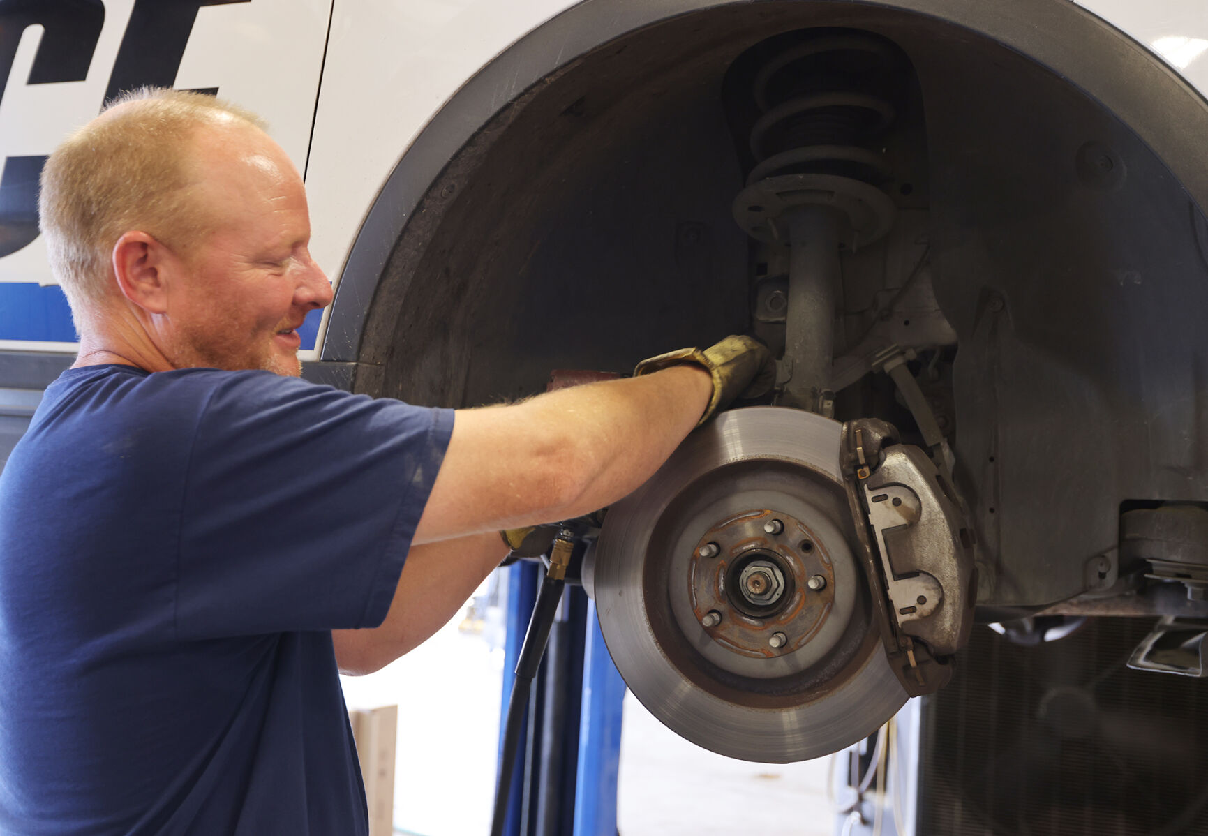 Brad Conditt works on the front suspension of a police car at the city of Waco’s maintenance garage. City leaders are discussing what it will take to retain employees during a tight job market.