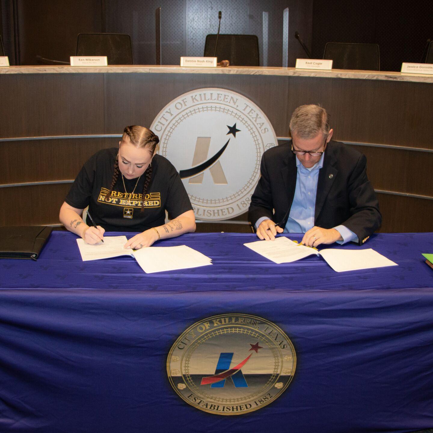 Chris Tootle (left) of Braids and Brows by Chris signs a contract with Killeen City Manager Kent Cagle for an American Rescue Plan Act Downtown Start-Up Grant this week at Killeen City Hall. The business is one of seven to receive grants totaling $965,812.