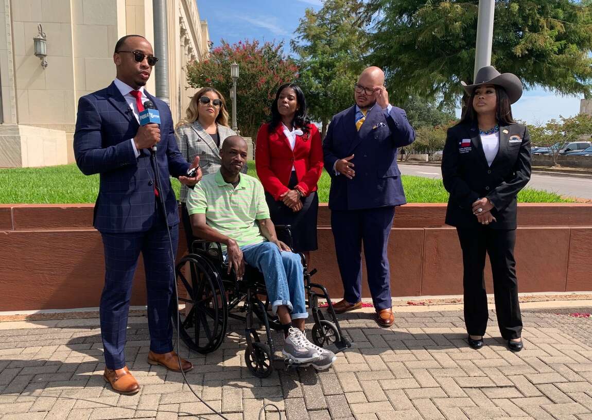Attorney Preston Strickland of Houston-based Strickland Law Firm on Thursday addresses the lawsuit his client Christopher Shaw, center, and other attorneys are filing after Shaw was paralyzed while in the custody of Beaumont Police. Photo taken July 14, 2022. Photo by Olivia Malick/The Enterprise Photo by Olivia Malick/ The Enterprise
