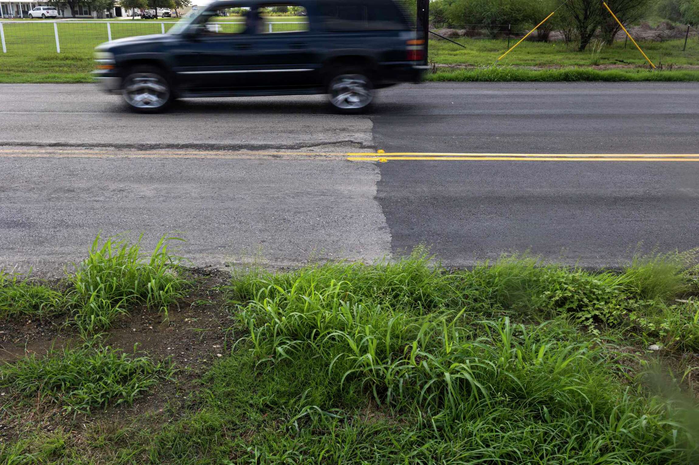 A car zips along West Klein Road in New Braunfels on Wednesday, crossing from new asphalt to old asphalt.