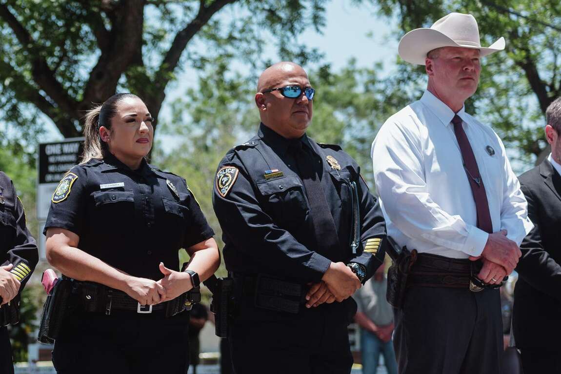 Pete Arredondo, center, the Uvalde school district police chief, at a news conference in Uvalde, Texas, on May 26, 2022. Facing intense pressure from parents, the school board in Uvalde on Wednesday, Aug. 24, 2022, terminated Arredondo, who directed the district’s police response to a mass shooting at an elementary school in which the gunman was allowed to remain in a pair of classrooms for more than 75 minutes. (Christopher Lee/The New York Times)