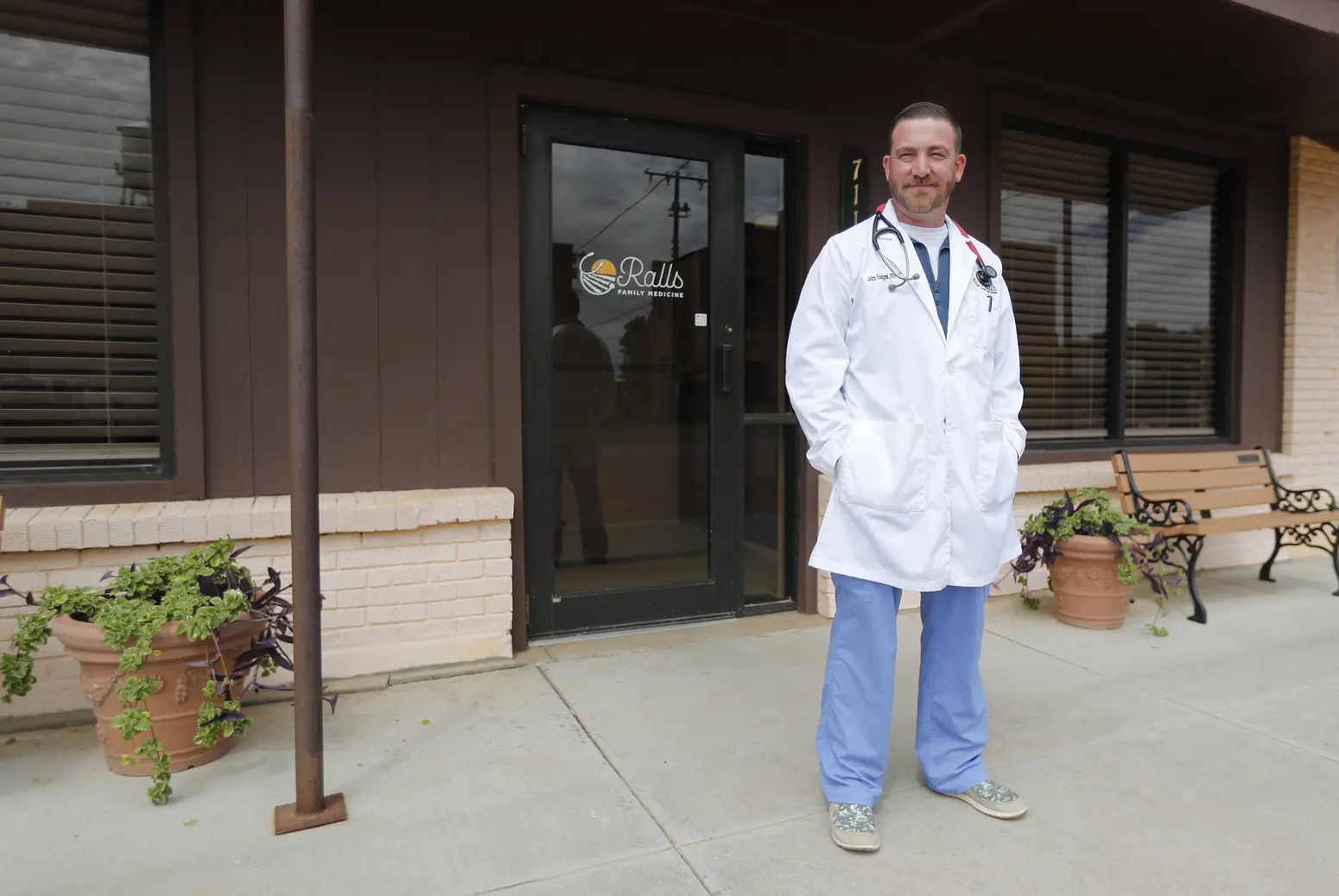 Family nurse practitioner John Hodges stands in front of his practice at Ralls