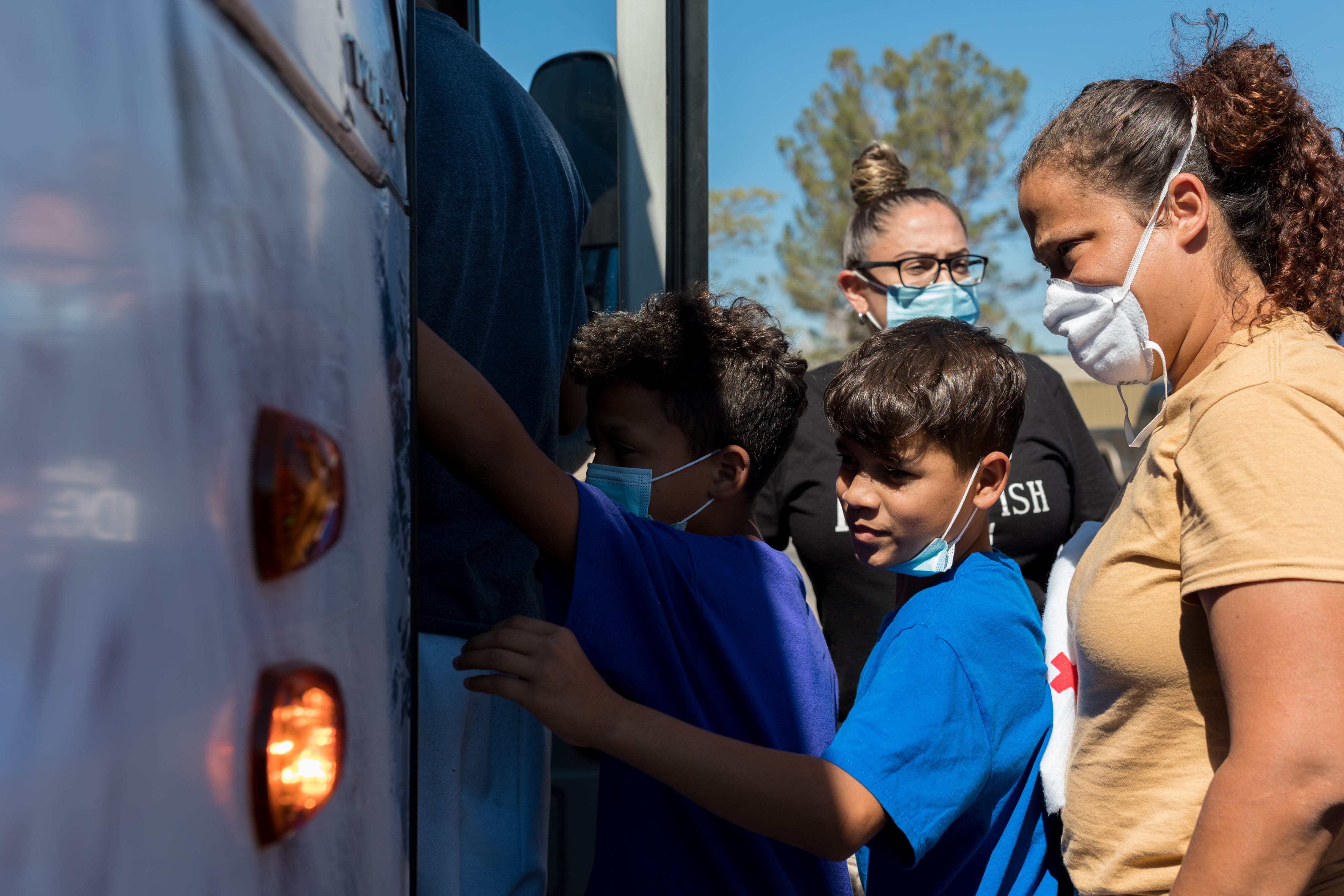 Migrants board a charter bus that will take them to their destination in New York. The City of El Paso and the Office of Emergency Management have managed a Migrant Welcome Center at the COVID Community Center in Northeast El Paso.