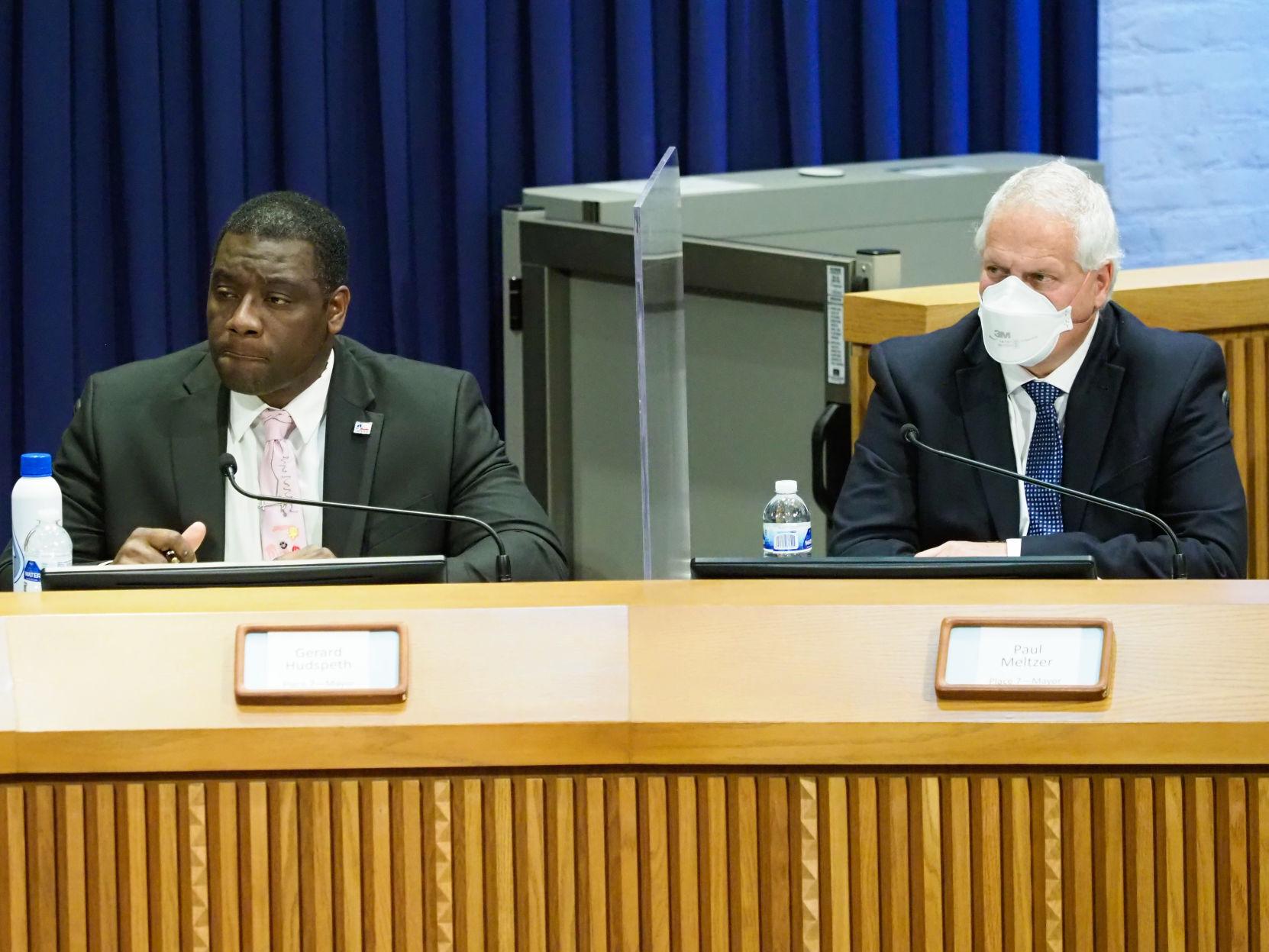 Gerard Hudspeth, left, and Paul Meltzer — who were running for mayor at the time — appear in an April 14 candidate forum presented by the League of Women Voters of Denton at City Hall.