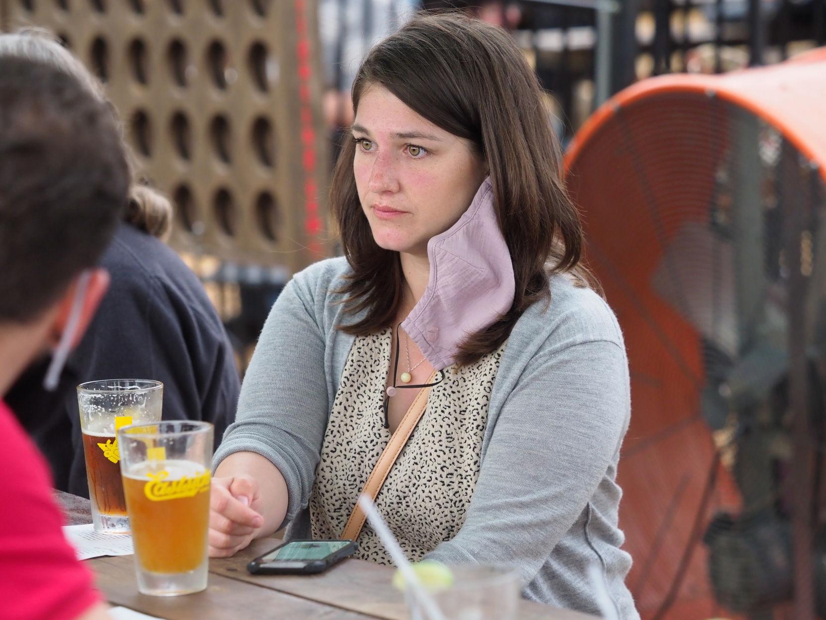 Denton City Council member Alison Maguire keeps an eye on election results on the evening of May 1, 2021, at East Side Denton. Maguire edged out incumbent John Ryan with 53% of the vote to win the District 4 seat but now faces a recall election, contested by a June 8 lawsuit, after the city voted to redistrict in December 2021.