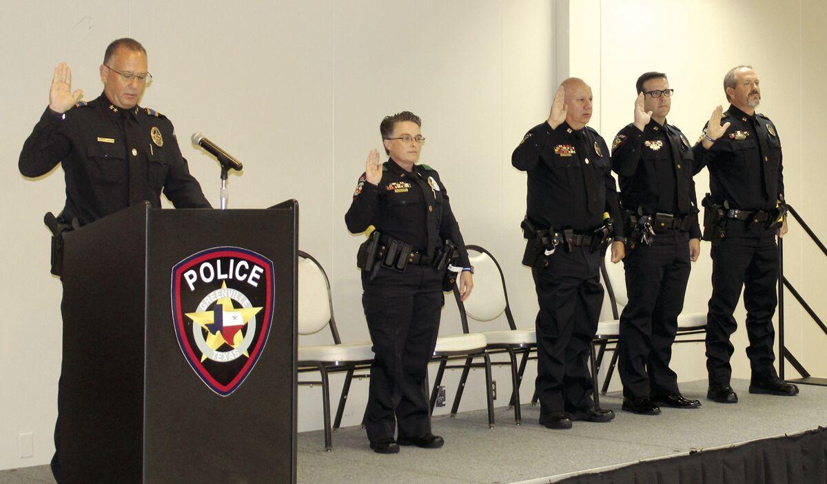 Greenville Police Chief Chris Smith, left, recited his official oath of office during a change of command ceremony Wednesday and was joined by members of his command staff, including from left, Lt. Jamie Fuller and Captains Charles Starnes, Adam Phillips and Aaron Huddleston.
