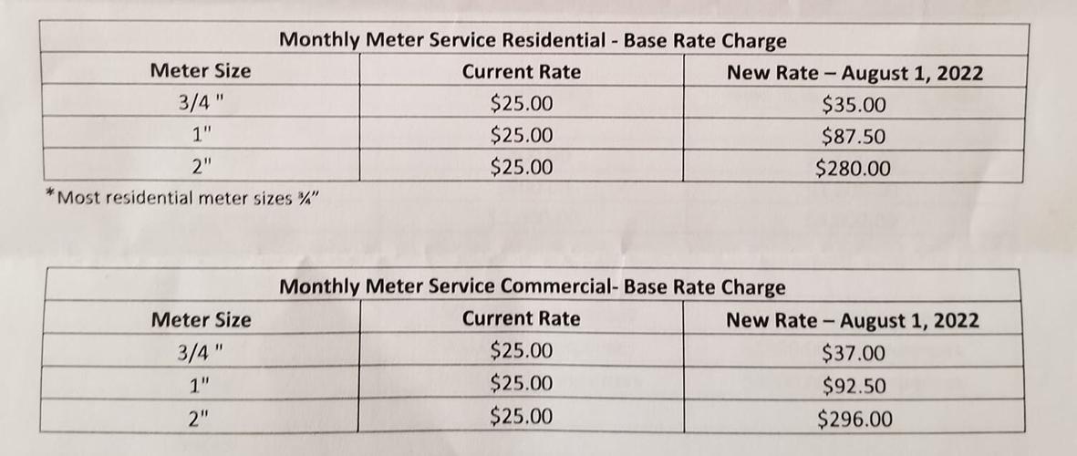 Residential and Commercial meter base rates increased in a similar fashion from the price of $25 for any size meter to a new, different rate depending on the meter size.