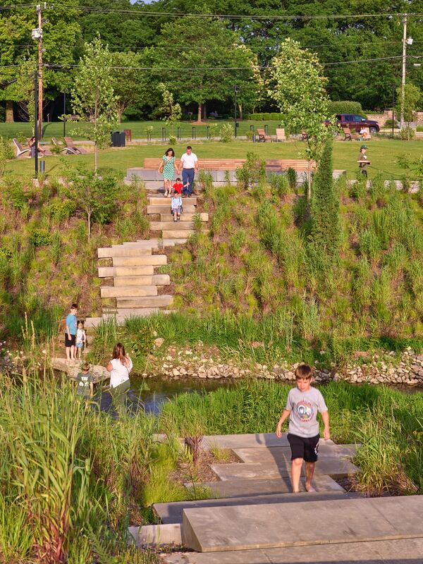 Grand Junction Plaza in Westfield, Indiana, designed by David Rubin of Land Collective, is designed to improve flood resilience as well as provide a public amenity.