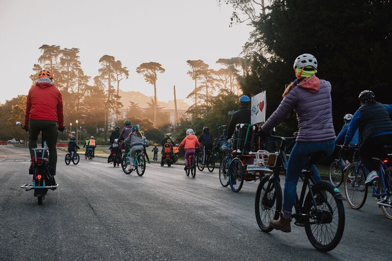 A group of students commute to school on bicycles in San Francisco in 2022.