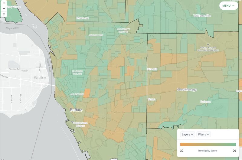 A map of tree equity scores across Buffalo, New York, shows how neighborhoods on the lower-income east side lack the canopy of more affluent areas.