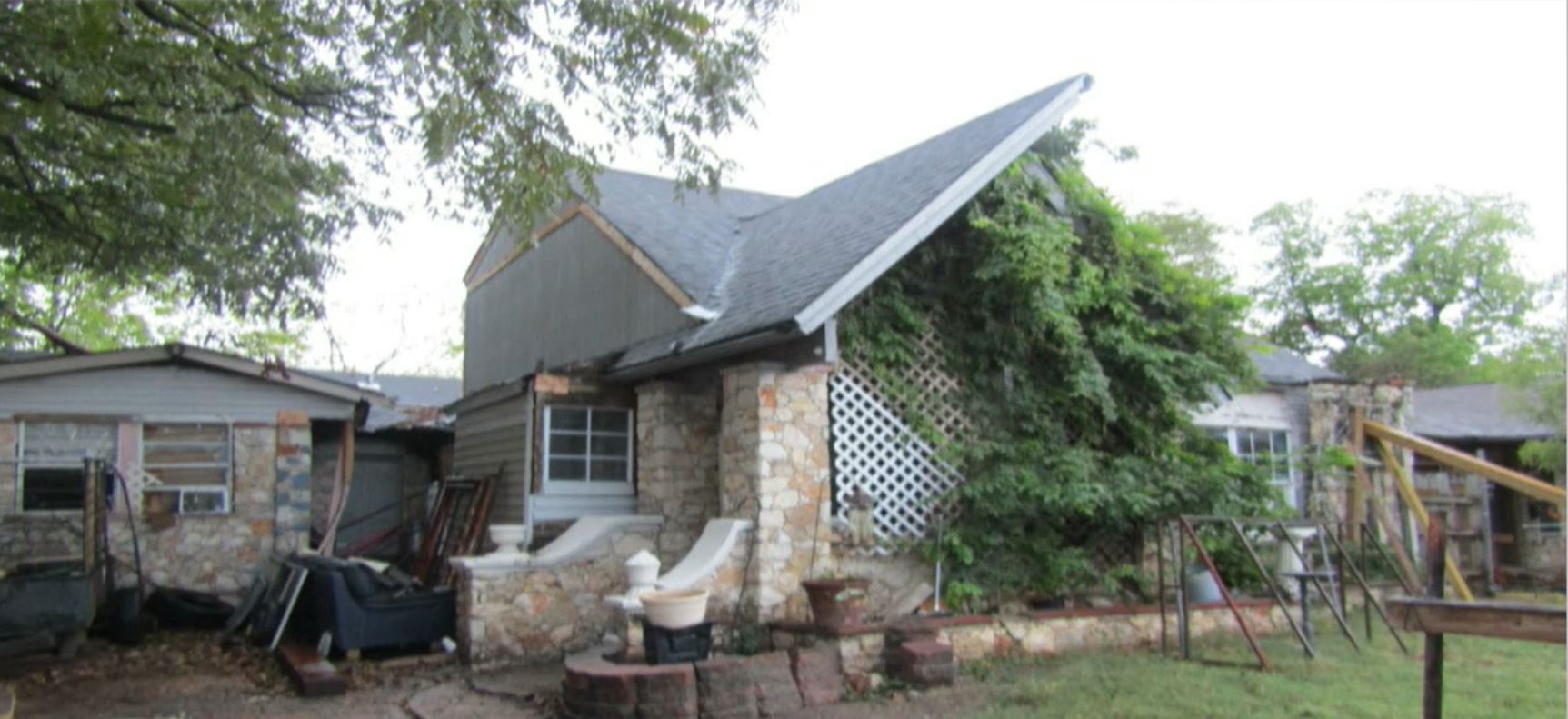 Photos of the home showed a tree growing out of the front facade. Wooden beams outside and inside the home were propped up to prevent it from collapsing.