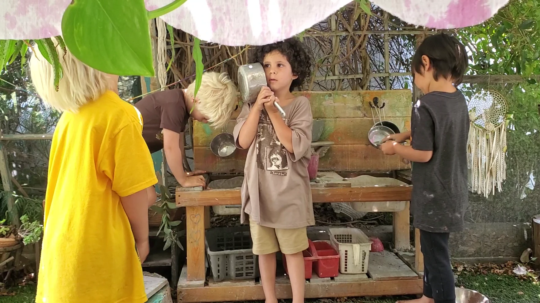 Kids play in the outdoor kitchen at Liberty Winn's child care center in San Diego County, Calif. May 18, 2022.