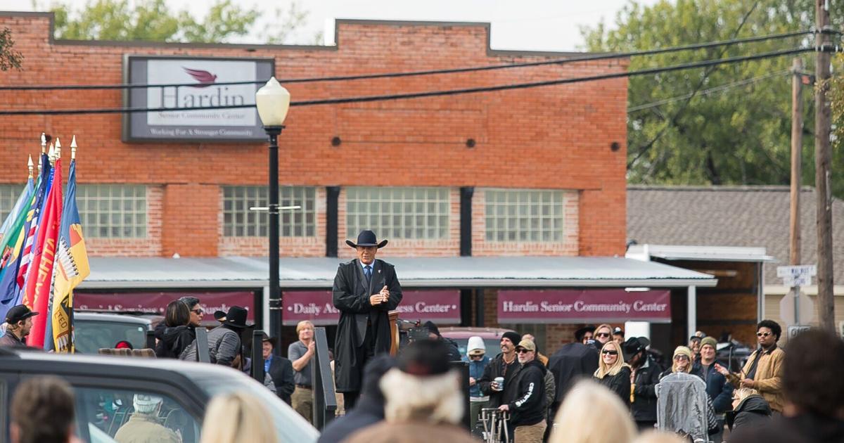 The scene Paramount was filming was of Costner, as Gov. John Dutton, giving a speech in Hardin, Montana.