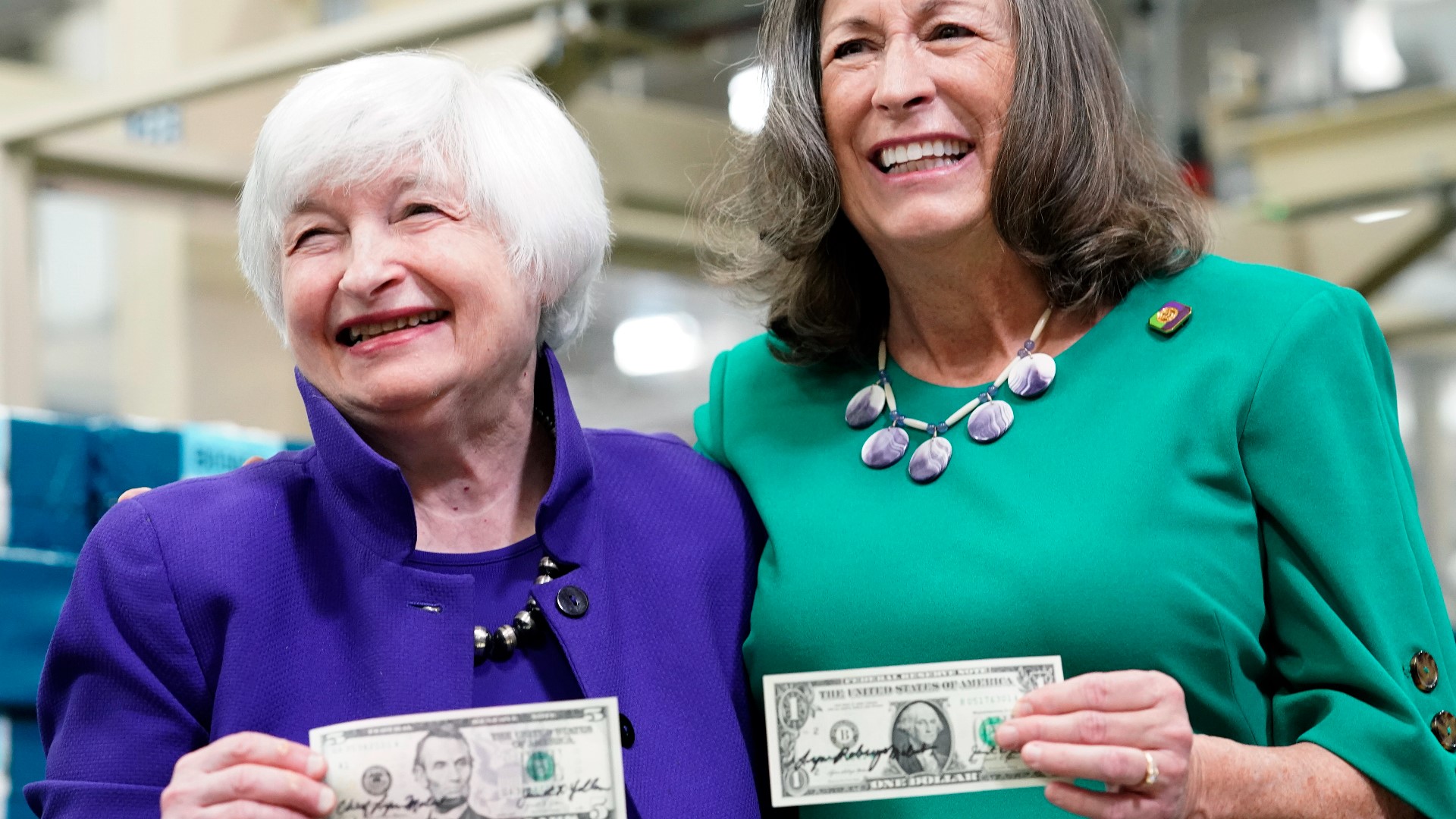 Secretary of the Treasury Janet Yellen, left, and Treasurer of the United States Chief Lynn Malerba show of money they autographed during a tour of the Bureau of Engraving and Printing's (BEP) Western Currency Facility in Fort Worth, Texas, Thursday, Dec. 8, 2022. Yellen unveiled the first U.S. currency bearing her signature, marking the first time that U.S. bank notes will bear the name of a female treasury secretary.