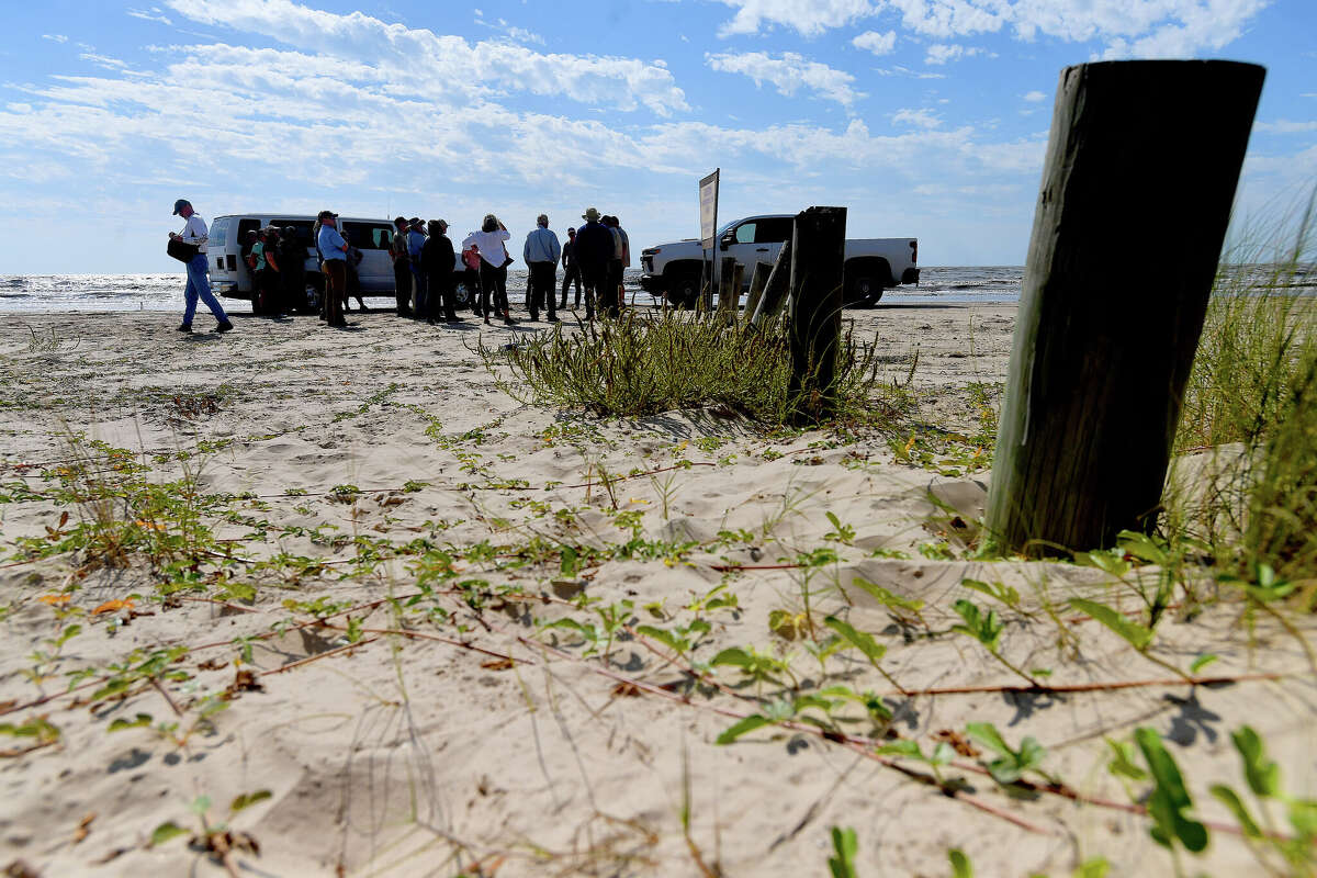 The tour group gathers on McFaddin Beach during a tour highlighting the successes and ongoing efforts to repair marshlands, coastal waterways and beaches in a 10-plus year Salt Bayou Marsh Restoration Plan in Jefferson County. The nearly $3 million project is a combined effort of multiple county, state, federal and private partnerships "to restore and maintain ecological functions and values to reverse the decline" occurring rapidly in the 139,000 acre Salt Bayou coastal marsh ecosystem, according to material provided by the project. Photo made Tuesday, October 11, 2022