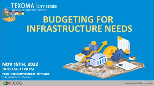 Sherman, Texas -- Please join Texoma Council of Governments (TCOG) on Tuesday, November 15 for our upcoming City Series Workshop entitled: Budgeting for Infrastructure Needs presented by Mr. Greg Peters, P.E., Director of Public Works for the City of Anna.