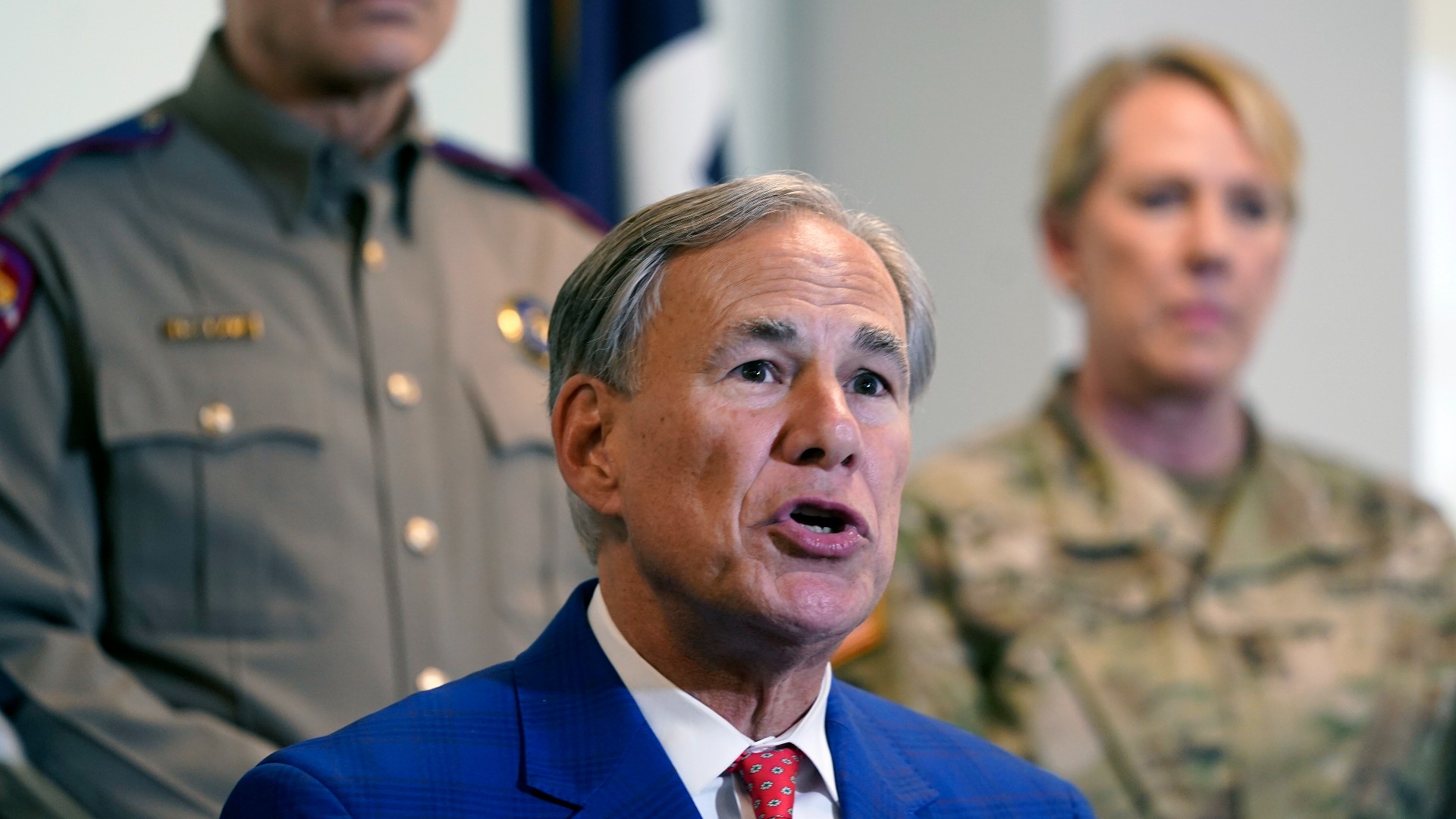 Texas Gov. Greg Abbott, front, speaks in front of Texas National Guard Director Maj. Gen. Tracy Norris, back right, and Director and Colonel of the Texas Department of Public Safety Steven McCraw after Abbott signed a bill providing additional funding for security at the U.S.-Mexico border, Friday, Sept. 17, 2021, in Fort Worth.