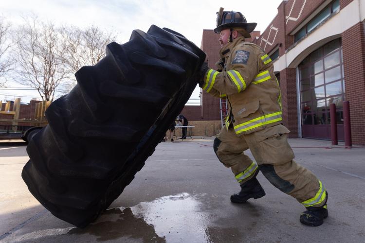 Dustin Nash does tire flip workout at Bryan Fire Starion #1 on Monday.