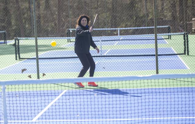 Susie Patterson plays on one of 12 new pickleball courts at Maroney Park, where a grand opening was held on Friday.