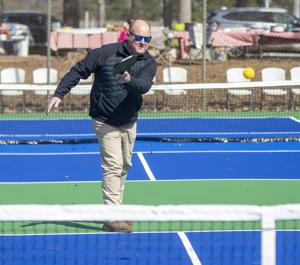 Nacogdoches Mayor Jimmy Mize plays the first game of pickleball on the newly dedicated courts at Maroney Park on Friday.