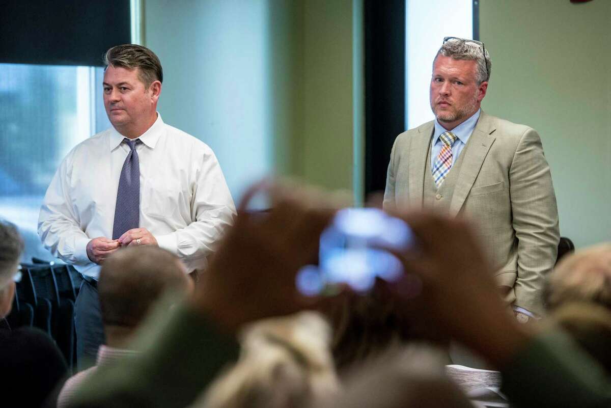 One-time apartment developer Michael Wibracht, right, and former partner Mark Tolley are shown during a 2015 meeting with residents regarding a development. Wibracht was sentenced to two years supervised release Wednesday for conspiring to defraud the federal government.