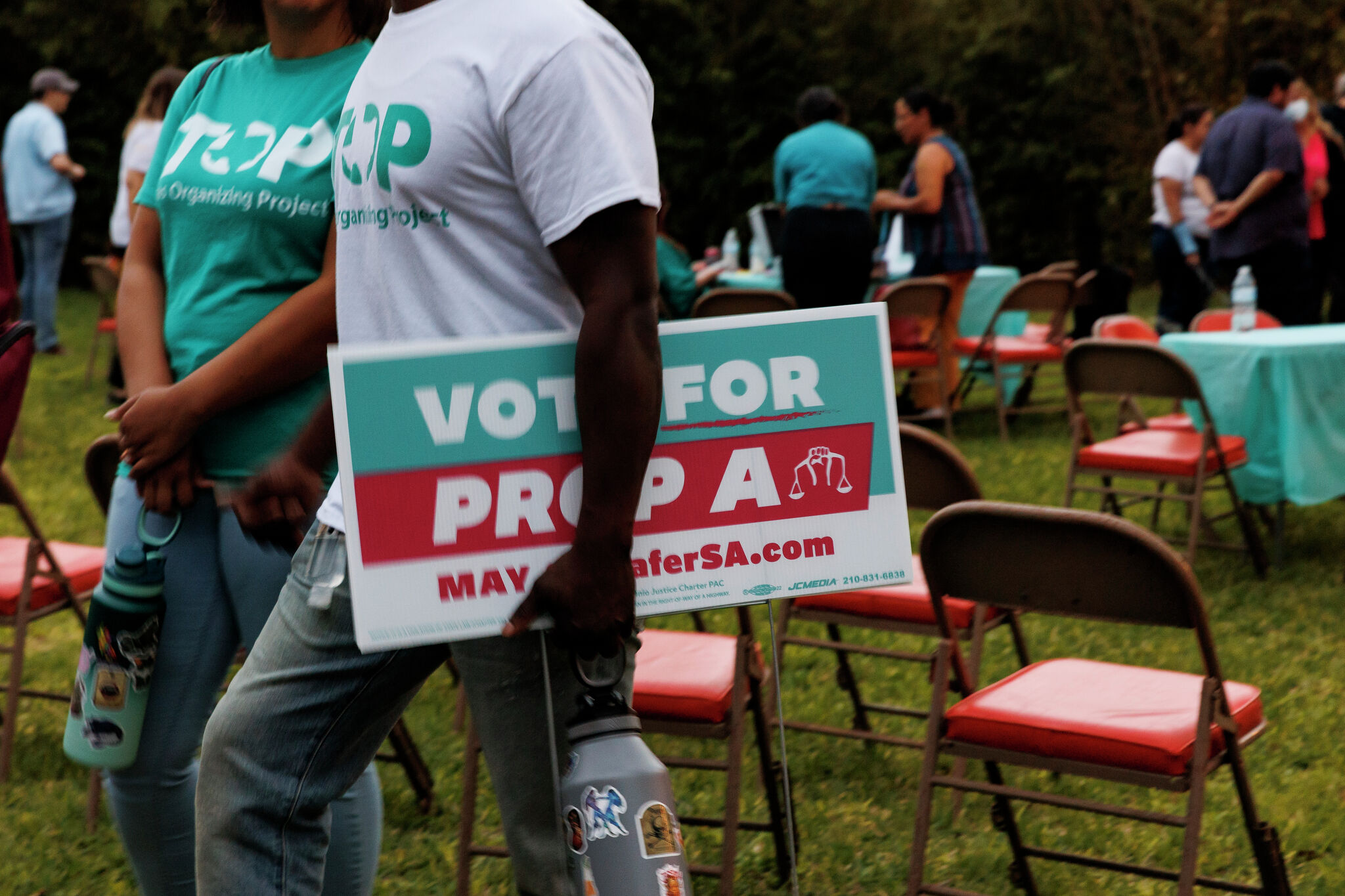 Signs in support of Proposition A, also known as the Justice Charter, were given out during a campaign launch party in San Antonio, Texas, Thursday, March 16, 2023. Proposition A will appear for voters on the May 6 city election ballot.