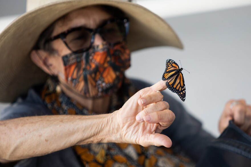 Monika Maeckle, founder of the Monarch Butterfly and Pollinator Festival, releases a butterfly in San Antonio in October 2020. The annual festival was hosted online because of the pandemic.