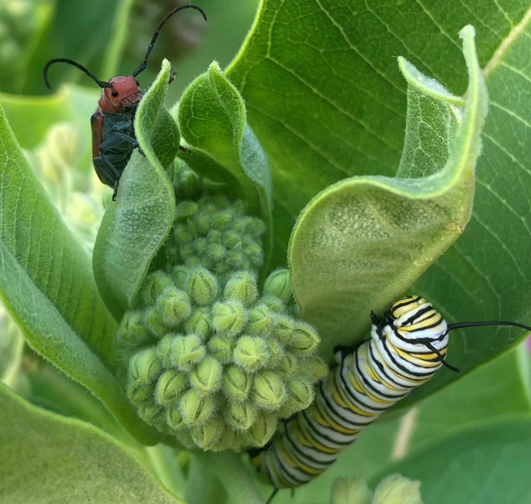 / A monarch caterpillar and a milkweed beetle munch on common milkweed in Ginger Werp's garden in Overland Park last summer.