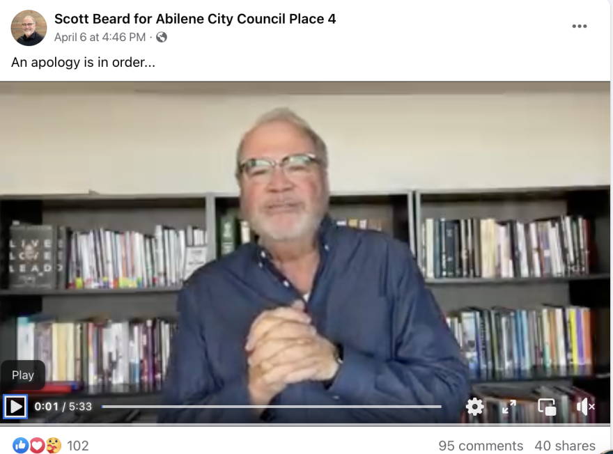 After issues with distributing campaign signs at church, and confusing wording on campaign mailing, Abilene City Council Place 4 candidate Scott Beard is facing a new complaint. Michael Bob Starr says the Texas Ethics Commission has begun an investigation based on a complaint he filed in April. Starr reported that Pastor Beard has used the FountainGate Fellowship property for his campaign’s mailing address, to store and distribute campaign materials, and as a setting for media interviews
