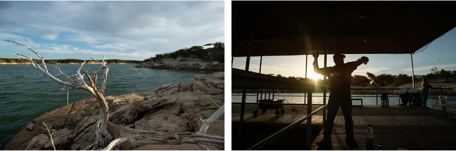 First: A dead tree sits near the bank of Lake Alan Henry. Last: Ross Gomez catches a crappie from the lake.
