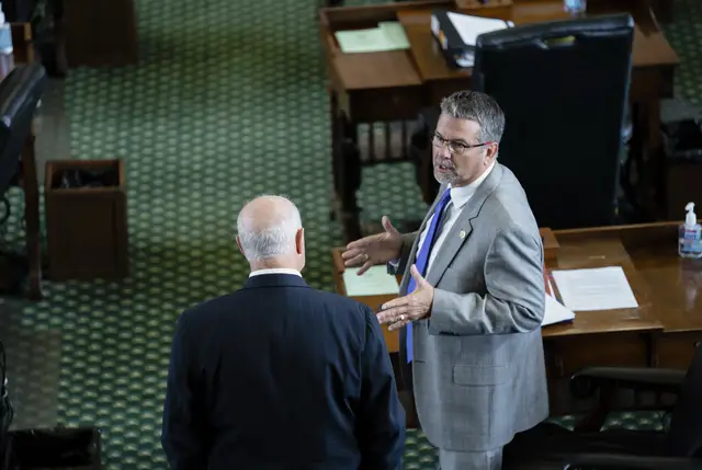 State Sen. Charles Perry, R-Lubbock, at right, talks with Kel Seliger, then a state senator from Amarillo, on the Senate floor on Aug. 10, 2021.