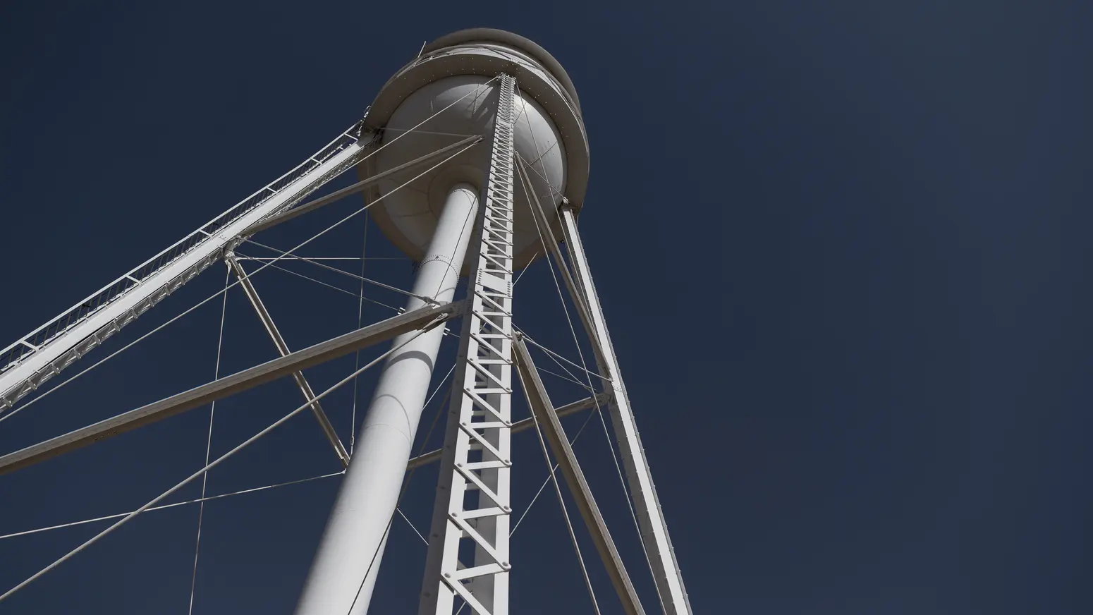 One of the City of Wolfforth’s water towers stands across the city from the construction site of a future neighborhood on April 26, 2023.