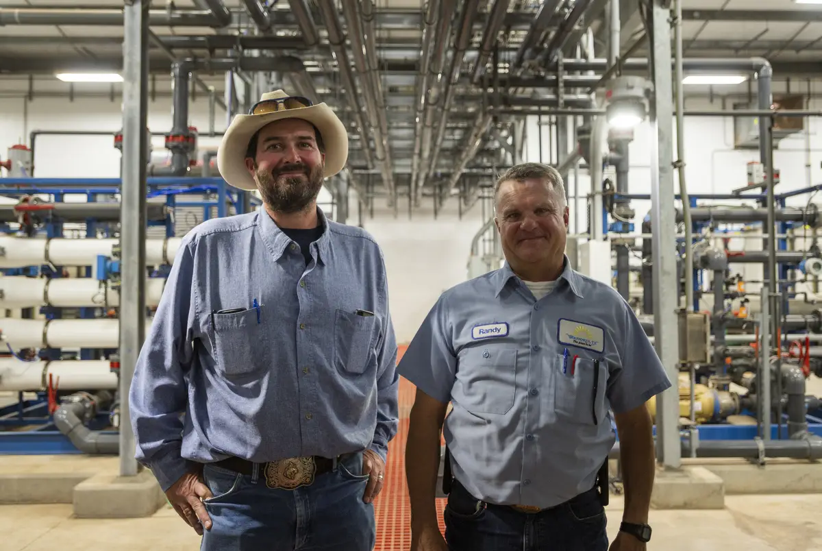 From left: Field Superintendent Coley Hitt and Plant Operations Director Randy Hall in the filter and pump room at the Wolfforth water treatment facility.