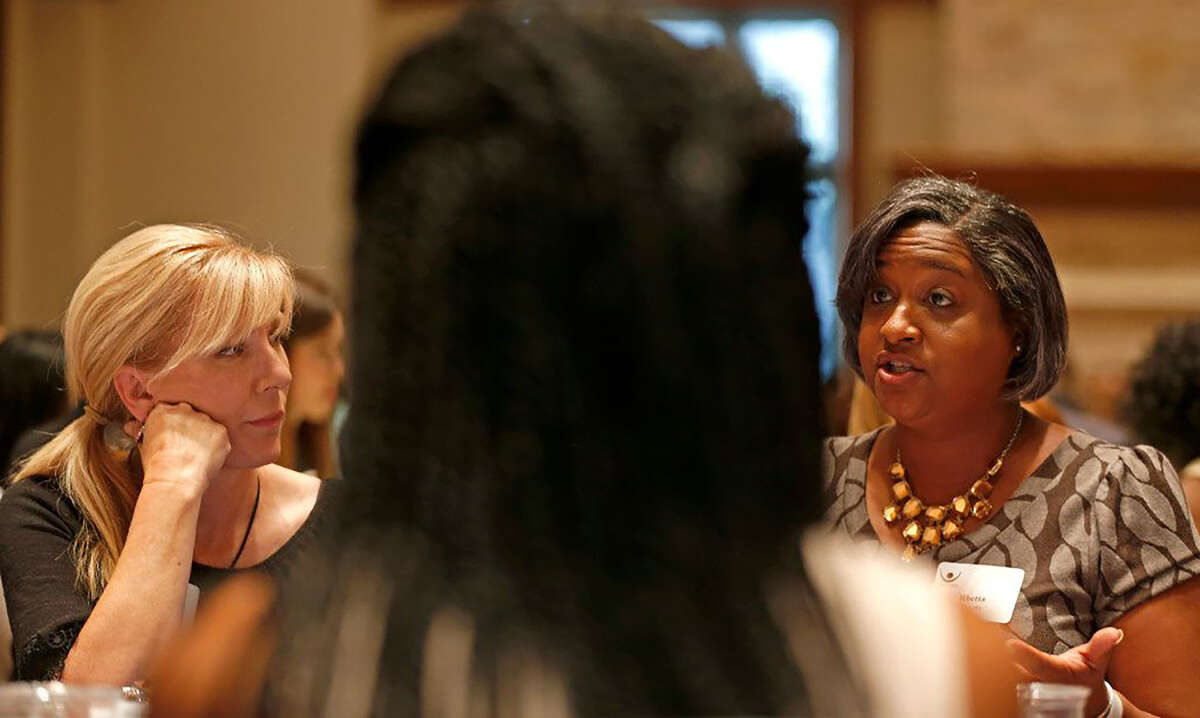Rachel Ridge, left, watches Rep. Rhetta Bowers talk about race at the dining table during the Together We Dine event. A bill carried by Bowers, D-Garland, prohibiting racial discrimination on hairstyle or hair texture based on race is headed to the governor after the Senate passed it.