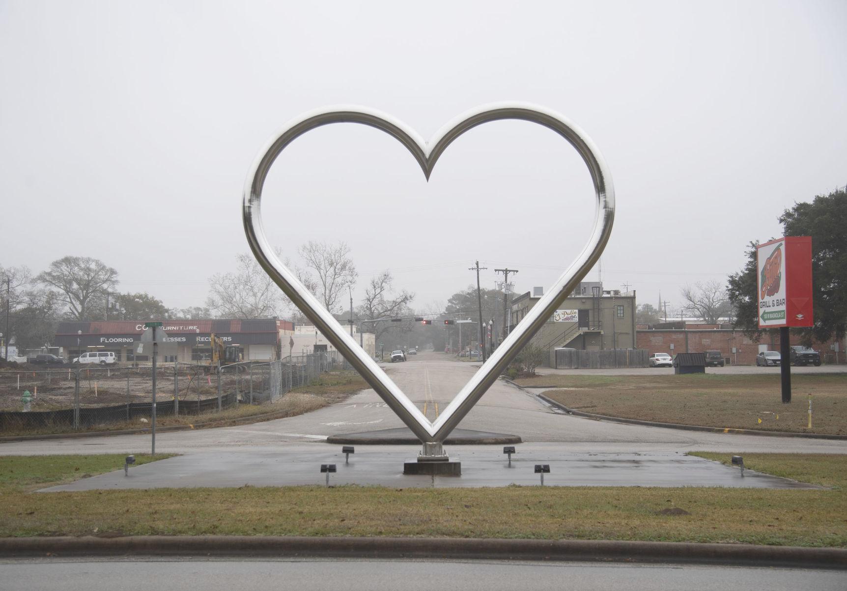 One of the iconic hearts placed near downtown Angleton is shown Saturday.