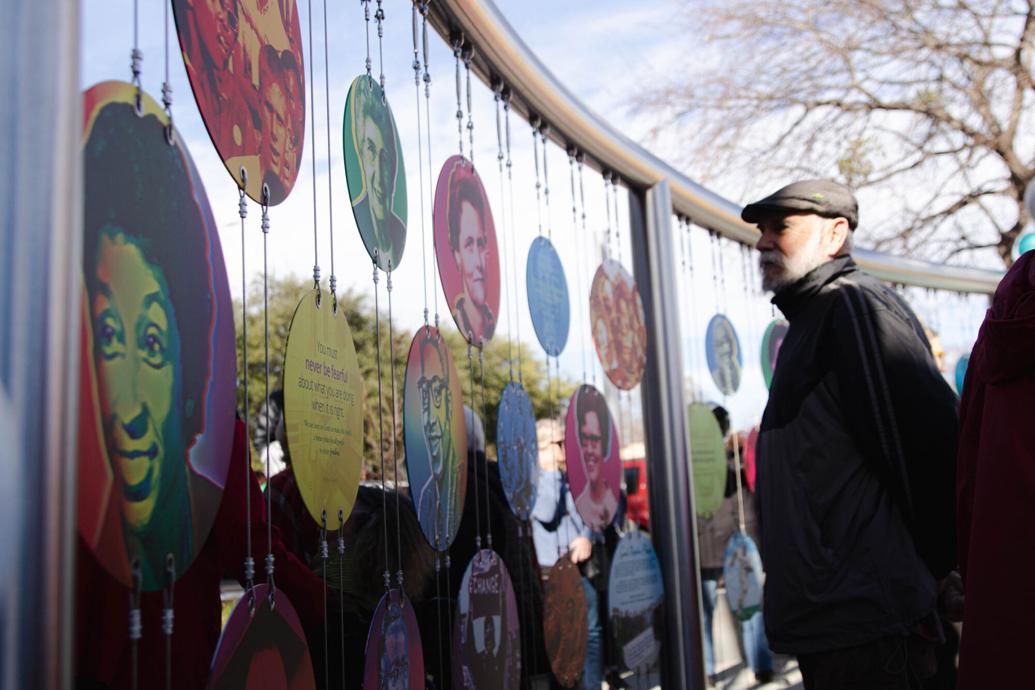A visitor examines the Denton Women’s Interracial Fellowship monument during its unveiling in 2021.