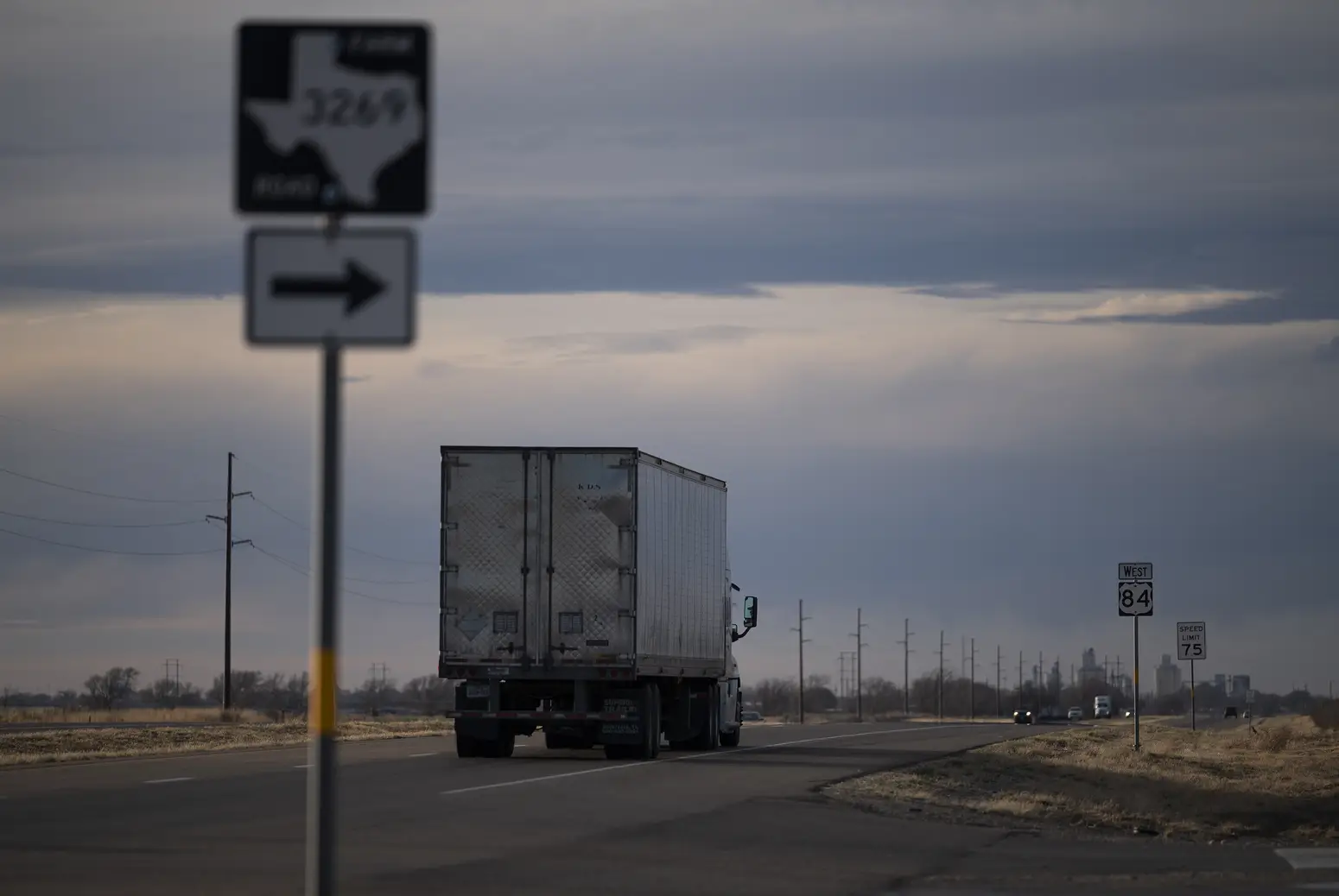 A truck drives down Highway 84 toward Muleshoe. The town is closer to New Mexico than it is to Lubbock, the nearest city.