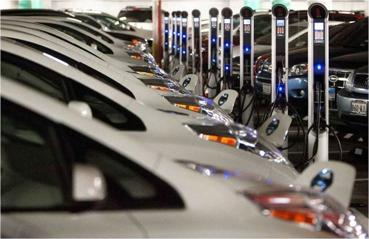 City of Houston electric vehicles sit ready for charging in a downtown parking garage in December 2013.