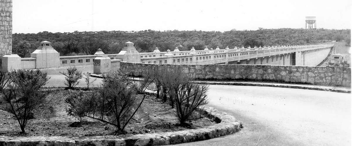 An undated photo of the old Olmos Dam roadway looking east. The roadway opened in 1926 as part of the original dam's construction. It was torn down and moved downstream from the dam in the late 1970s.