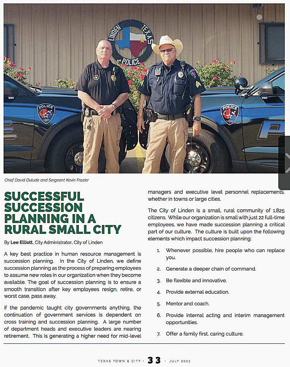 There, on pages 34-35, is the suggestion from a small Northeast Texas town that other towns across the state might develop the best practice tactic of succession planning.
