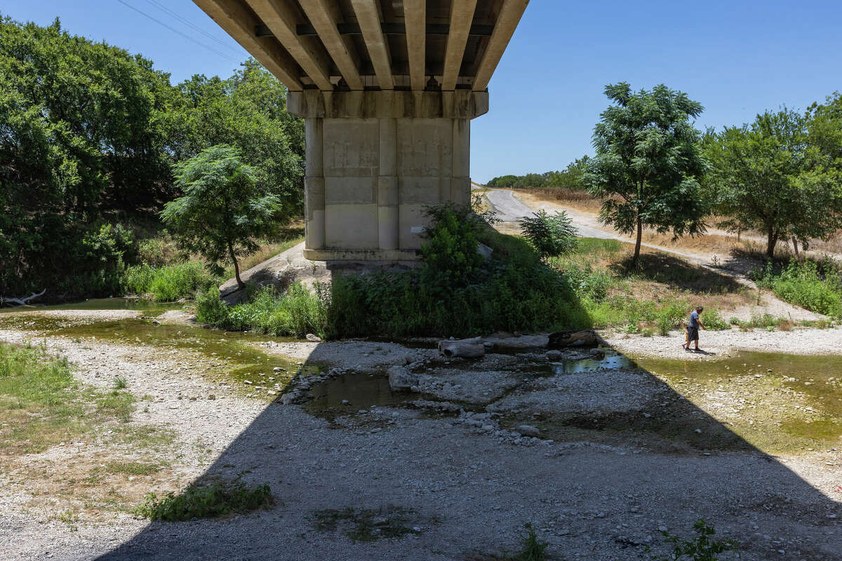 A person walks in the nearly dry Guadalupe River Thursday, July 20, 2023, as it flows under the FM 1376 bridge near Sisterdale. All the Unites States Geological Survey river gauges between Comfort and Canyon Lake were reporting zero water flow in the river Thursday, according to the USGS water data website, though some flow could be seen. The median flow of the river for July 20 at the nearby Comfort gauge is 74 CFS, according to the USGS water data website.