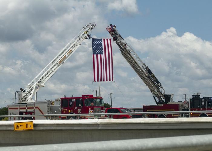 A U.S. flag is draped on the East Loop 121 bridge over Interstate 35 on Wednesday for the funeral procession of Cameron Police Sgt. Josh Clouse, who was killed in the line of duty last week.