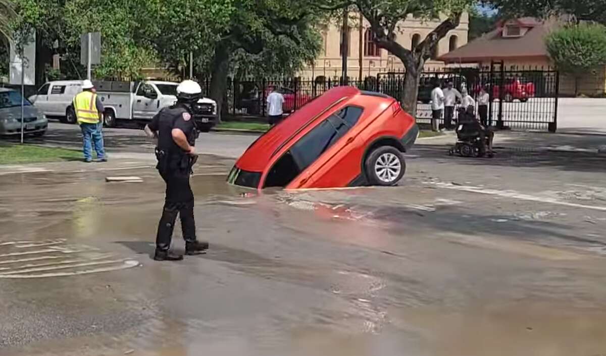 A man narrowly escaped from a car window after driving into a sinkhole in Galveston on Tuesday, May 23.