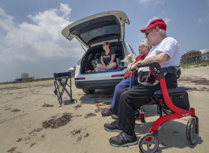 Katy resident Bev Smith sits with her parents, Judy and Colin Stone, at their parked car at a special use parking area adjacent to Stewart Beach in Galveston on Tuesday.